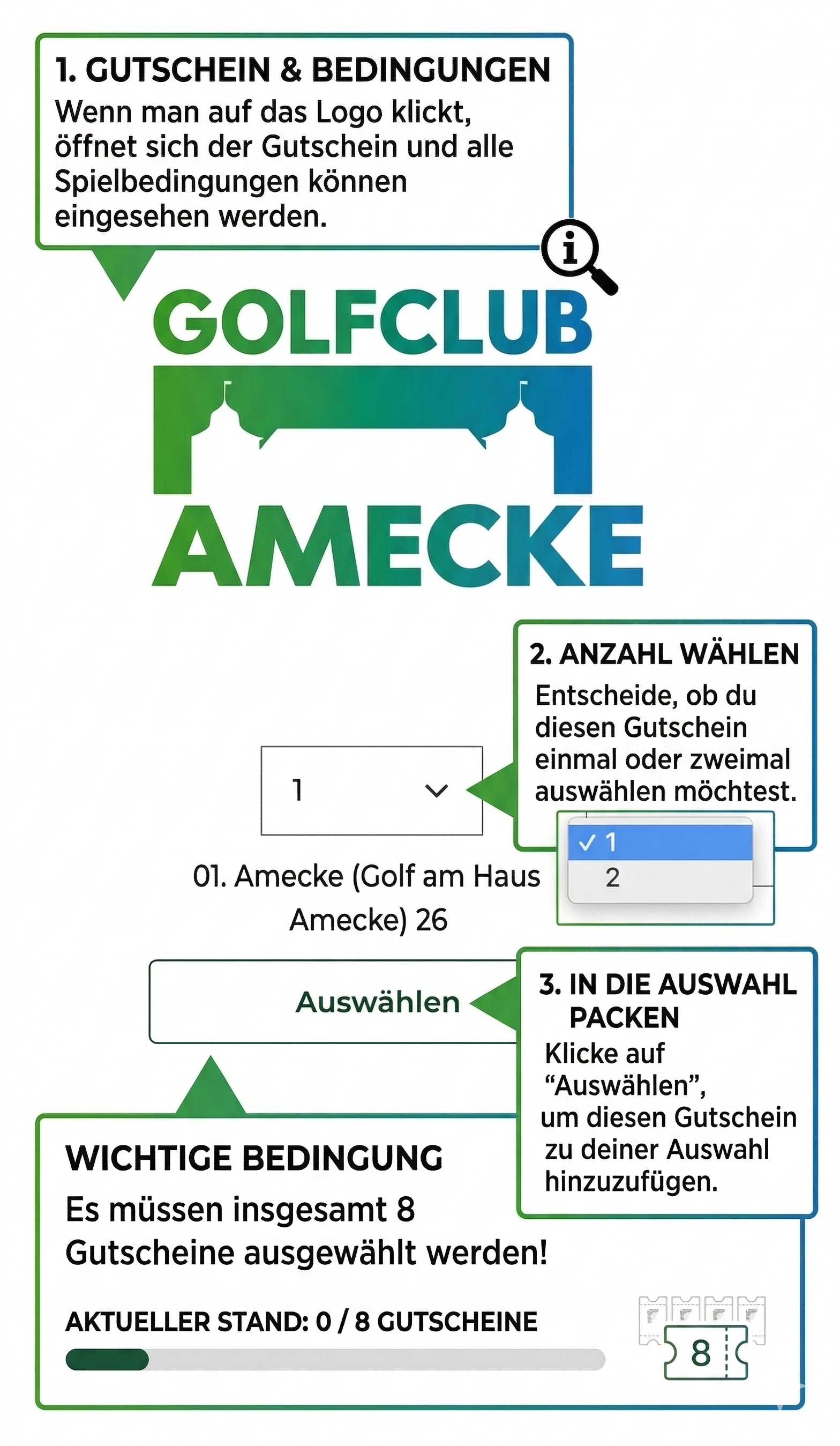 Bedingungen prüfen: Klicke zuerst oben auf das Logo (Golfclub Amecke). Dadurch öffnet sich der Voucher und du kannst alle dazugehörigen Spielbedingungen in Ruhe einsehen.